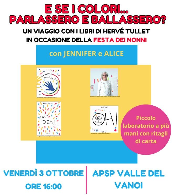 Un viaggio con i libri di Hervè Tullet in occasione della Festa dei Nonni con Jennifer e Alice. Piccolo laboratorio a più mani con ritagli di carta.