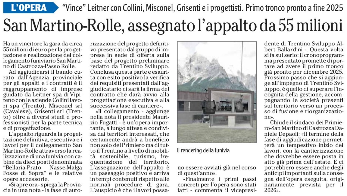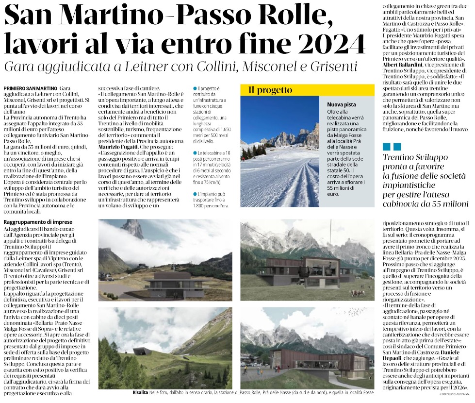 Proseguono infatti i lavori propedeutici alla realizzazione del collegamento San Martino-Passo Rolle. L’opera è stata appaltata alla ditta Leitner, incaricata di realizzare il collegamento in cordata con le aziende Collini lavori spa, Misconel srl e Grisenti srl. È stato firmato il contratto, ci si avvia alla fase conclusiva dell’iter autorizzativo propedeutico all’inizio dei lavori dell’impianto.