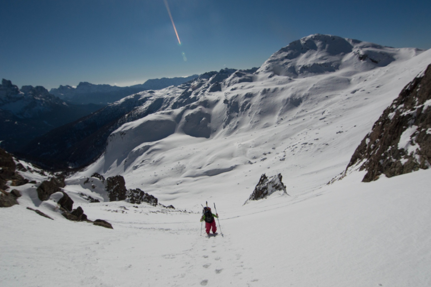 Eine wilde Route, die durch eine großartige Abfahrt gekennzeichnet ist, die auf offenen Hängen beginnt und dann durch eine felsige Schlucht im Ceremana-Tal führt.Eine ordentliche Schneeschicht und sichere Bedingungen sind erforderlich; auch für weniger erfahrene Skifahrer geeignet. Ein guter Aufstieg und eine spannende Abfahrt von et