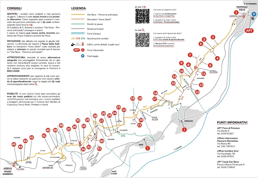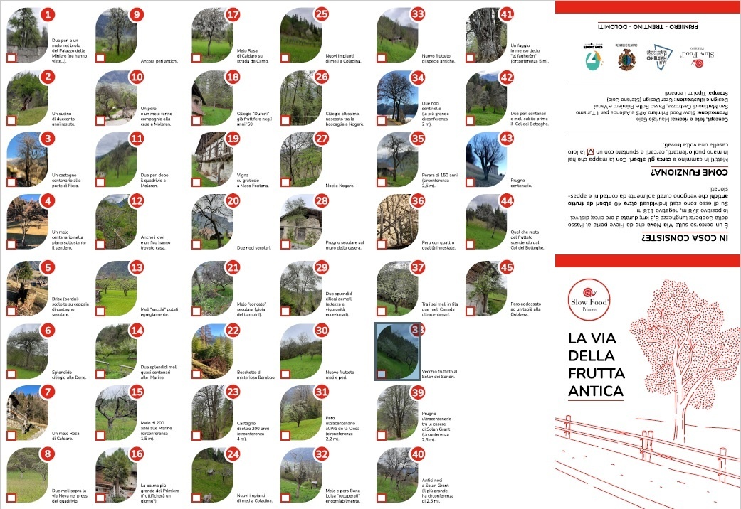 Die Via della Frutta Antica entstand aus einer Idee von Maurizio Gaio und Slow Food Primiero in Zusammenarbeit mit der Comunità di Valle. Der Weg folgt größtenteils der bereits existierenden Via Nova, welche Pieve mit dem Passo Gobbera verbindet, mit einigen Abweichungen vom Hauptweg für mögliche Zugänge von Imer und Mezzano. Die Gegend ist reich an zahlreichen alten Obstbäumen (Birne, Apfel, Kirsche, etc.). In dieser Route sind über 40 davon katalogisiert, alle auf der von Maurizio erstellten Karte verzeichnet (siehe Bilder).