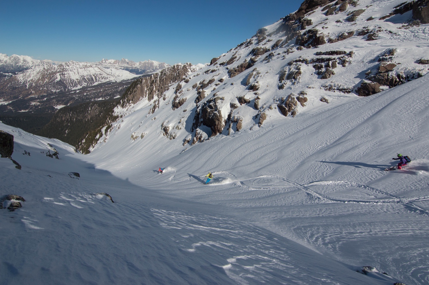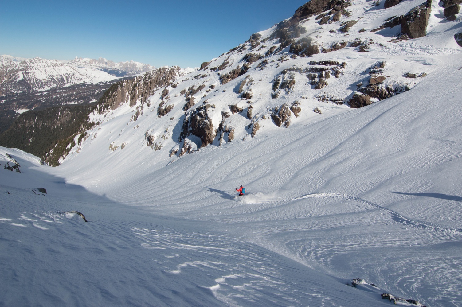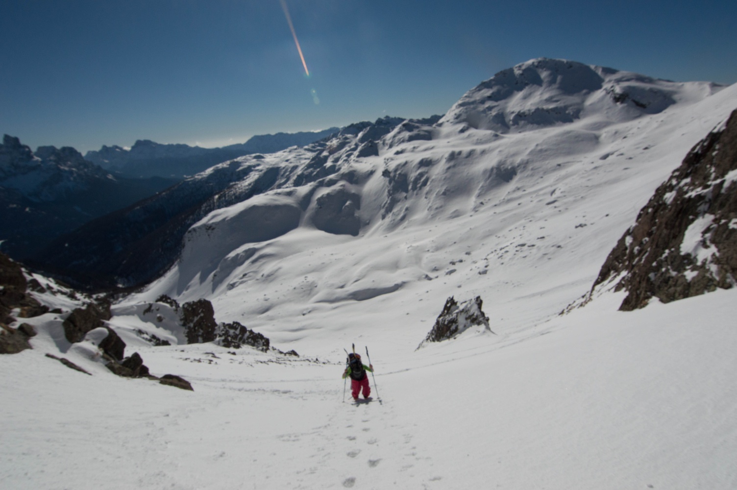 Diese wilde Route ist gekennzeichnet von einer wundervollen Abfahrt, die sich zuerst unter den offenen Abhängen auftut und dann entlang dem felsigen Canyon im Val di Ceremana.Eine gute Schneelage und sichere Bedingungen müssen gewährleistet sein, dann kann diese Route auch von weniger erfahrenen Skifahrern gemacht werden. Es ist ei
