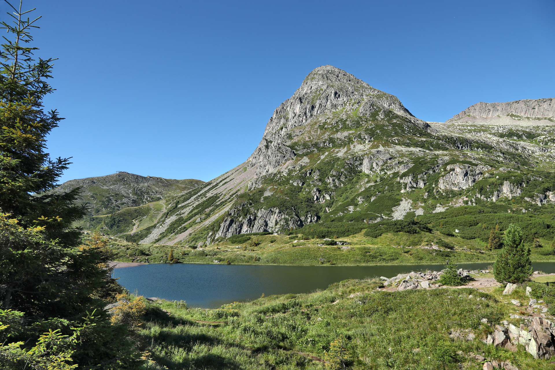 Ein für alle geeigneter Weg, der sich durch einen Lärchen- und Tannenwald schlängelt, führt zu den beiden Gewässern und zur gleichnamigen Schutzhütte.