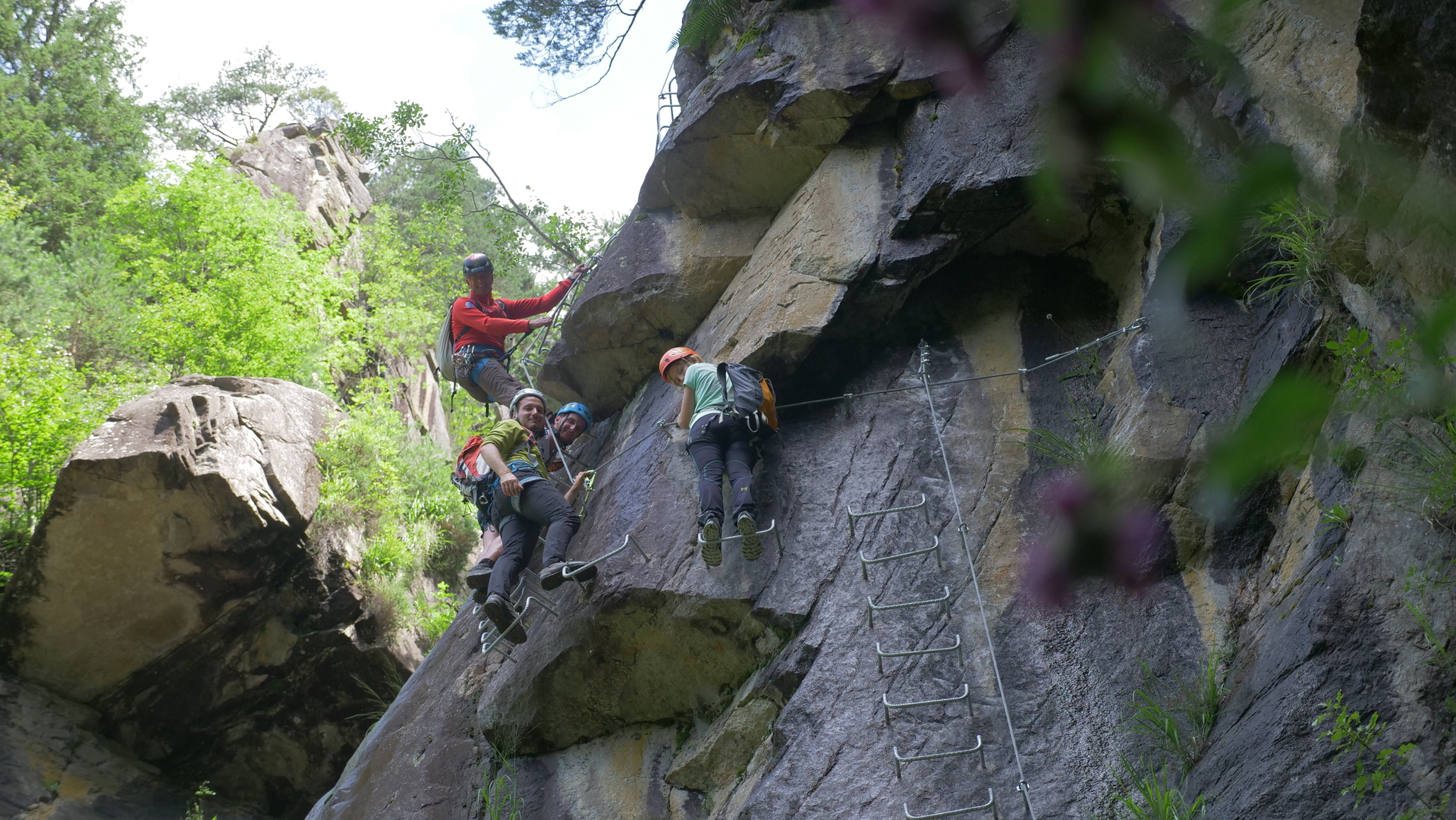 Der didaktische Klettersteig Val di Scala im Vanoi-Tal in der Nähe des Dorfes Caoria ist nicht nur eines der wenigen Beispiele für Klettersteige auf Granit in geringer Höhe, sondern auch einzigartig in seiner Art, da er sehr gut mit dem Auto erreichbar ist. Man beginnt auf 700 Metern Höhe und erreicht einen Höhenunterschied von insgesamt 200 Metern, wobei ein erster eindrucksvoller Abschnitt an einem vertikalen Wasserfall entlangführt und eine abenteuerliche Passage über eine 12 Meter lange tibetanische Brücke vorsieht. Es ist ideal für Anfänger und vor allem für Familien, die älteren Kindern einen ersten Zugang zum Bergsteigen ermöglichen möchten, bevor sie sich an schwer zugänglichen Klettersteigen in den Dolomiten versuchen. Die beste Lösung ist, sich von den Führern der Bergsteigerschule Adler von San Martino und Primiero begleiten zu lassen, die Ihnen den richtigen Ansatz für diese Art von Routen beibringen können.