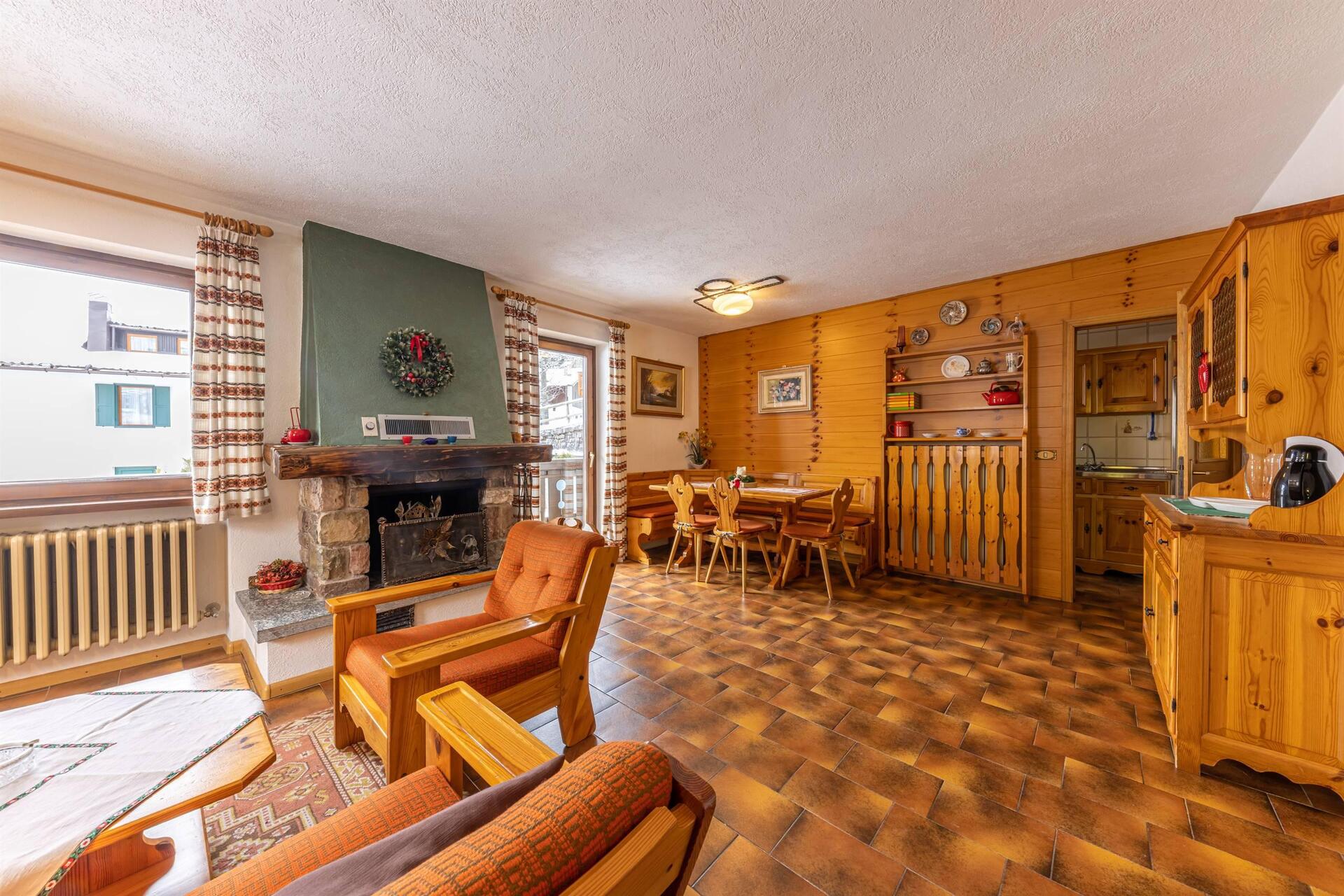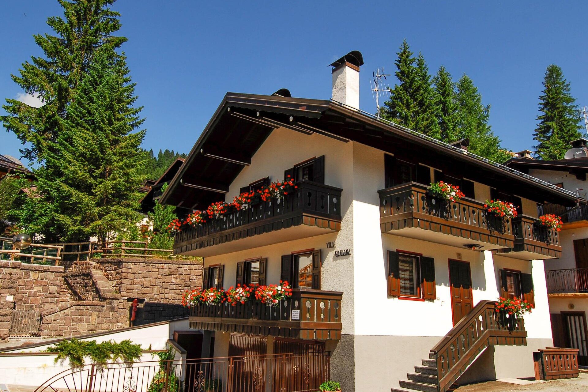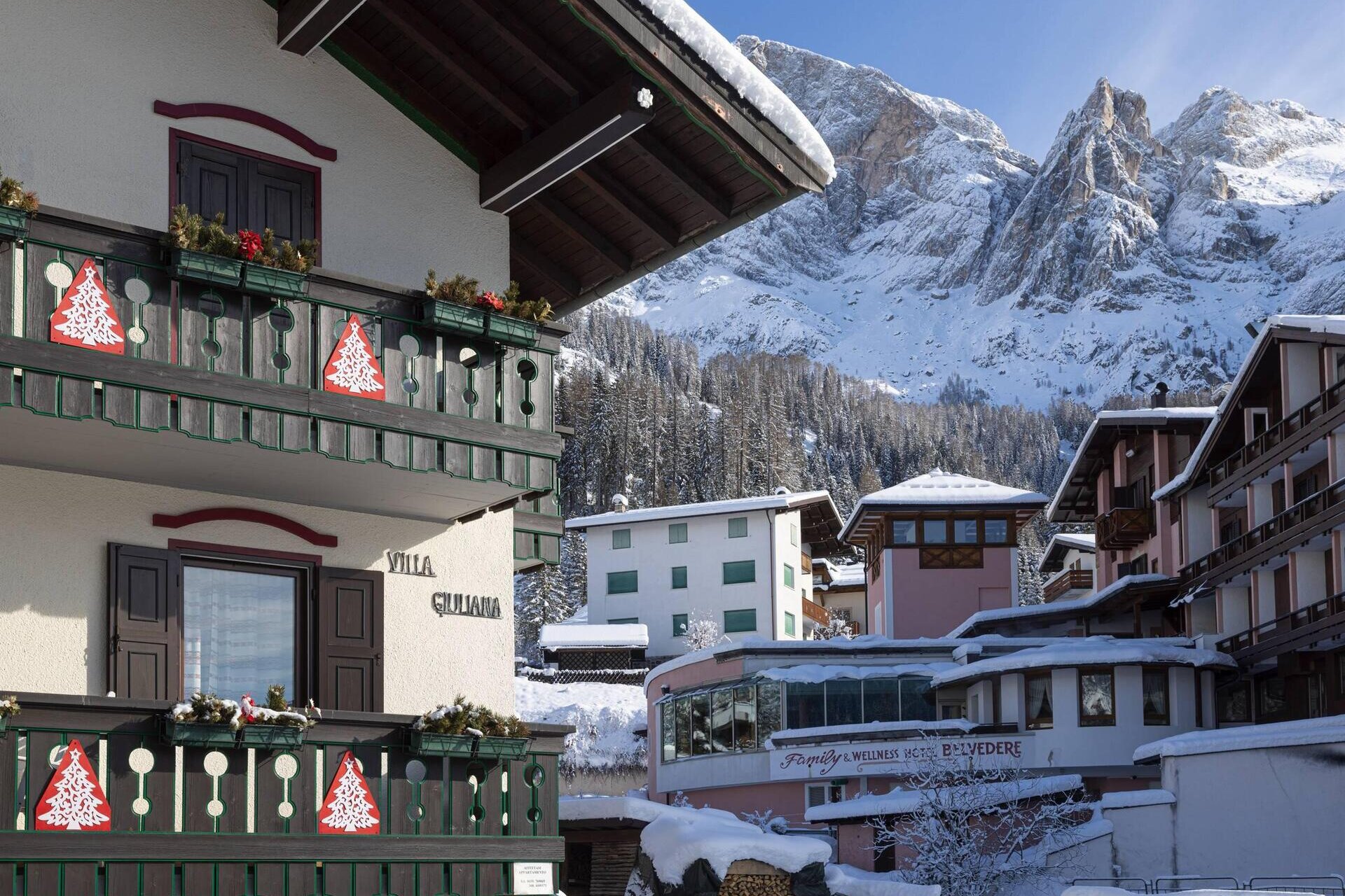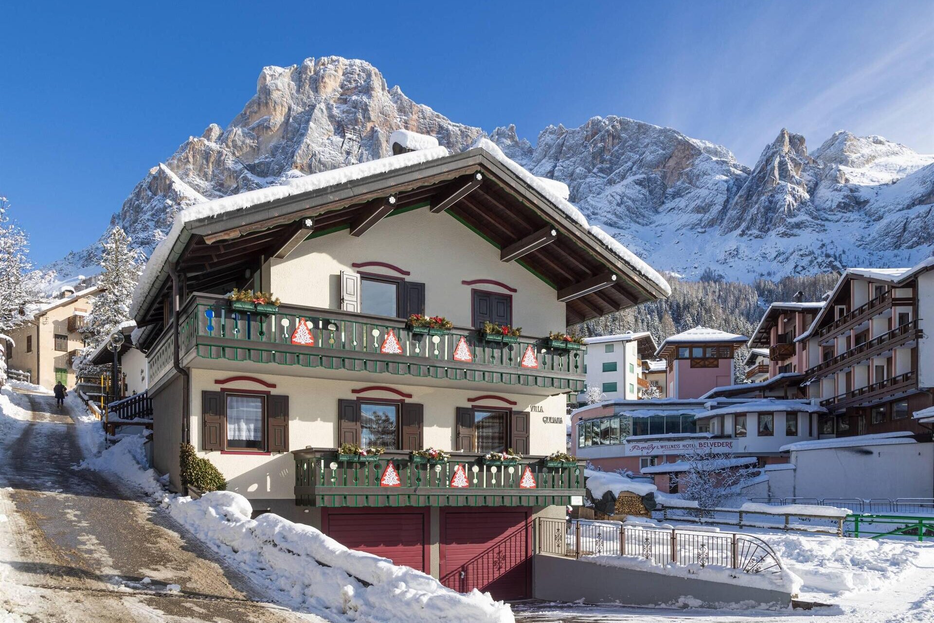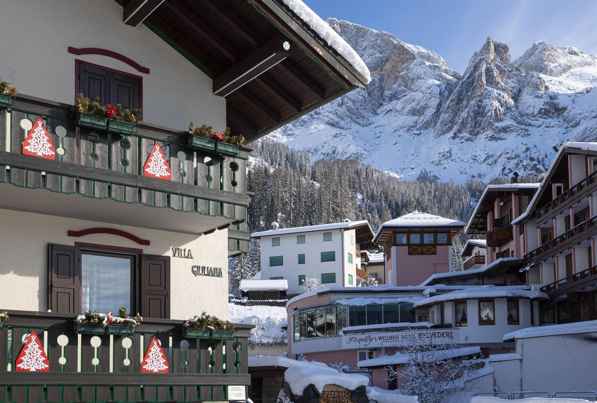 Apartment mit separatem Eingang, privatem Außenparkplatz und Garage; zwei Schlafzimmer (eins mit Doppelbett und eines mit zwei Einzelbetten), Wohnzimmer mit Essbereich und Küche. Wenn Sie sich für Villa Giuliana entscheiden, haben Sie auch Zugang zu den exklusiven Dienstleistungen des Hotels: dem Wellnessbereich und dem Mini-Pool; das WiFi in den öffentlichen Bereichen, den kostenlosen Ski-Bus im Winter und den Miniclub.