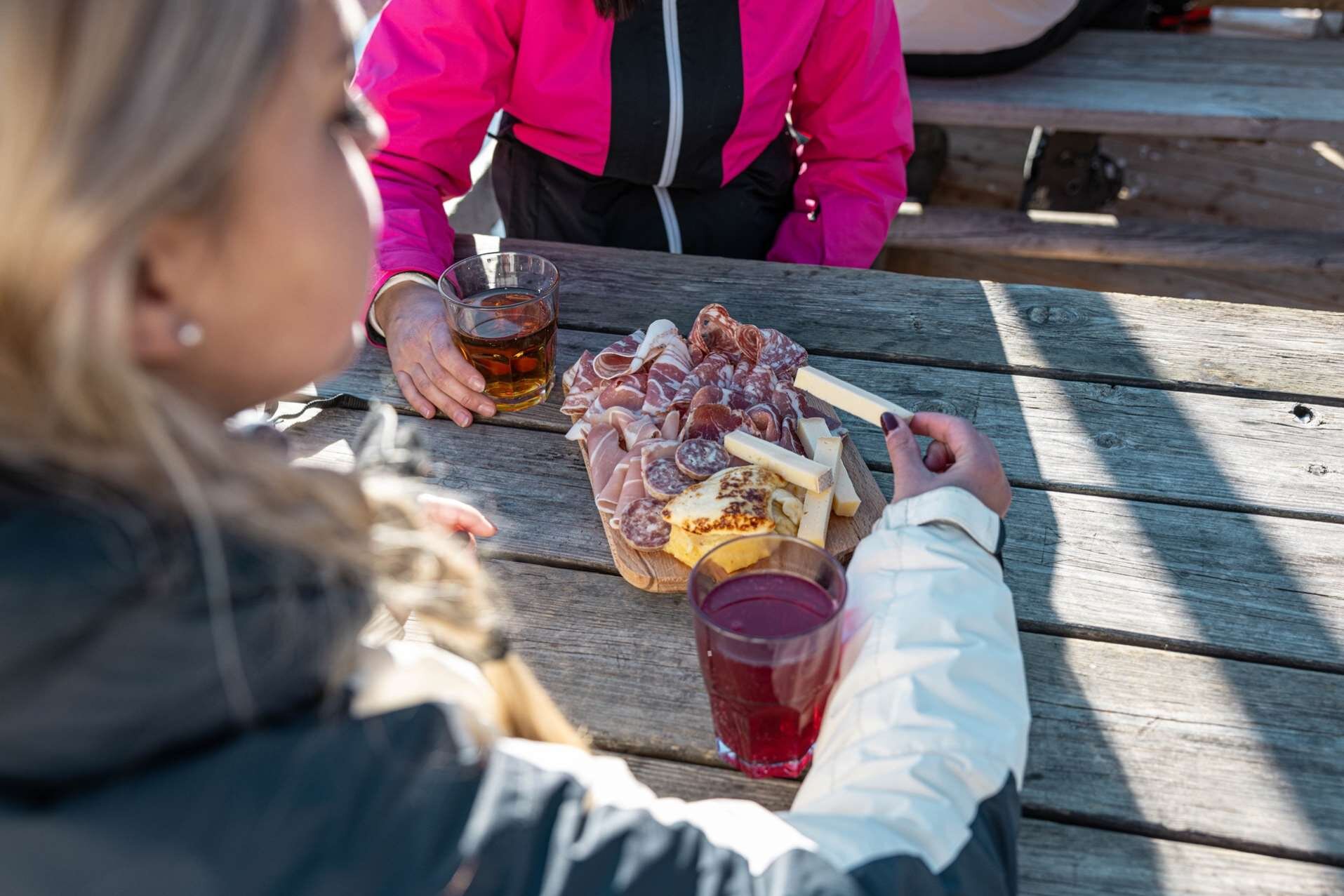 Wenn der Sonnenuntergang langsam naht, sollten Sie zur Alpe Tognola zurückkehren, um eine leckere Käseverkostung in Kombination mit anderen lokalen Produkten und Weinen aus dem Trentino zu genießen. Die Hütte Rifugio Tognola ist der perfekte Ort für einen ganz besonderen Aperitif, ein romantisches Anstoßen auf der Terrasse, während sich die Pala-Gruppe rosa färbt.
