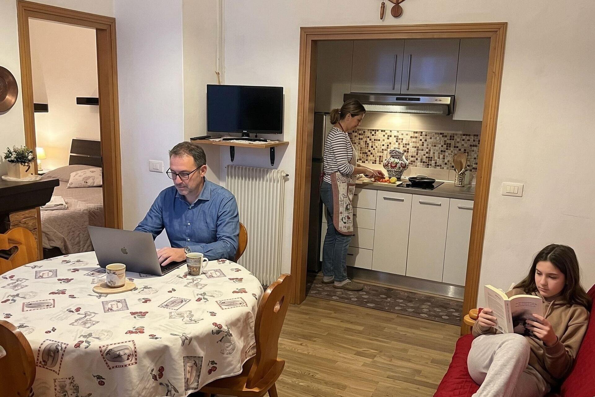 In the historic center of Fiera di Primiero, in an exclusive and peaceful context, there is an apartment with two comfortable double bedrooms with safety box ,a mountain-style living room with kitchenette, a bathroom with shower and a particular open space that can be lived in during the day and is romantic at the same time. evening. All floors are in bleached oak parquet. It offers free Wi-Fi and Smart TV with Amazon Prime Film and Paramount++.Equipped with induction hob, kitchen and tableware, electric kettle, multifunction microwave, washing machine and iron. A stone's throw from the pedestrian area, the shopping center, and where you can immerse yourself in the atmosphere of colors and flavors typical of the Dolomites. Bars, restaurants and characteristic shops will welcome you and delight you with their high quality products and discounted treatment.
