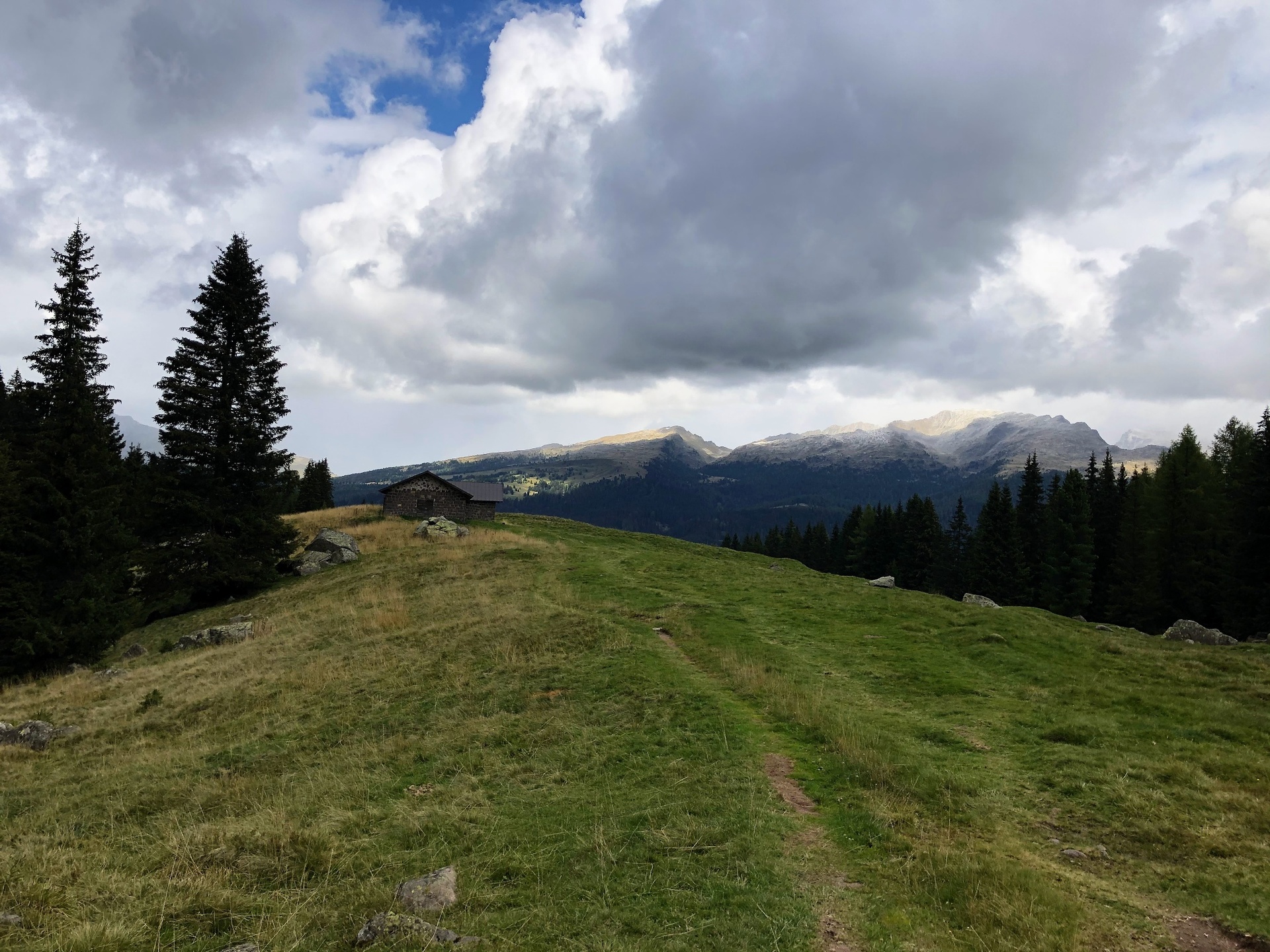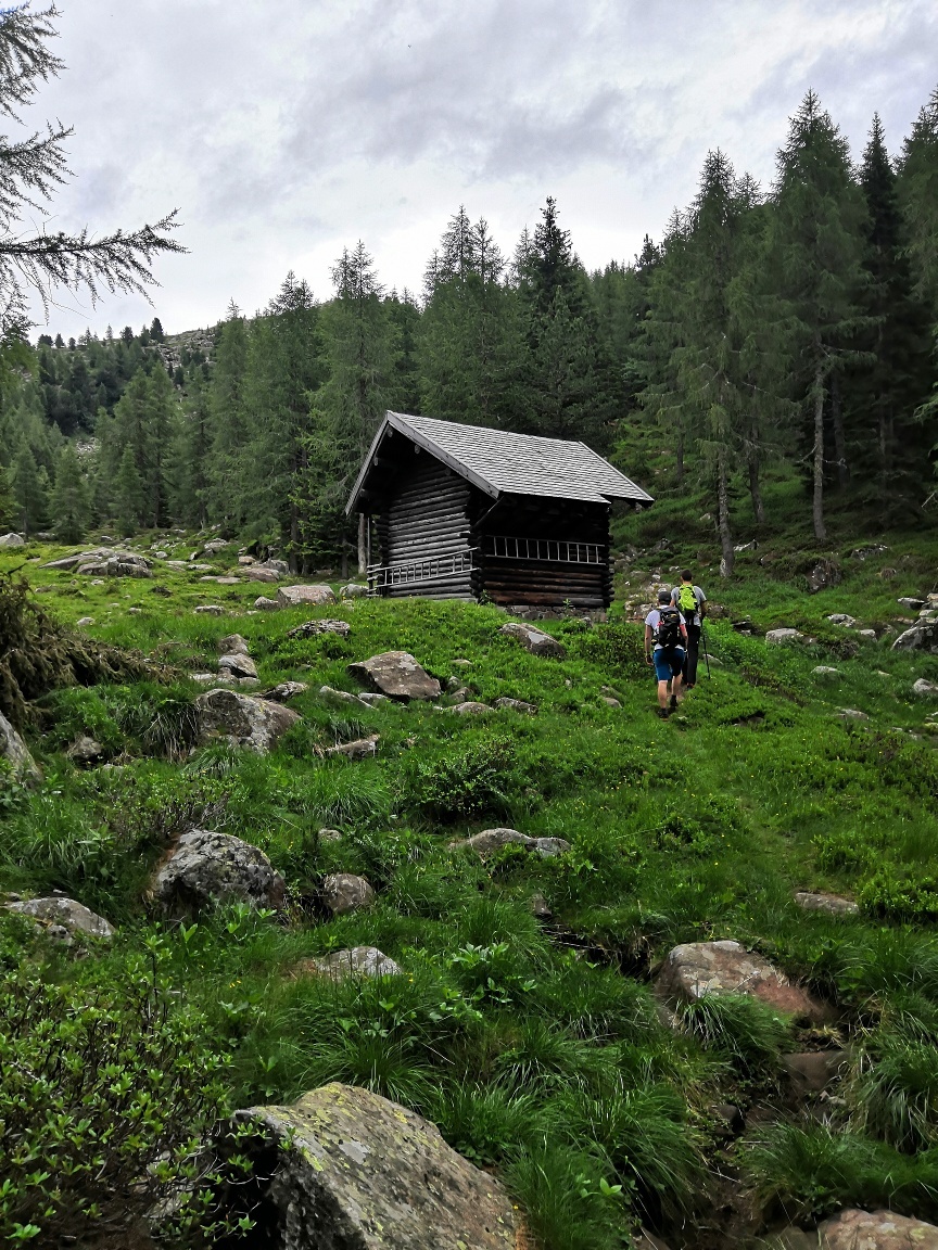 From the first remains of military trenches, visible just a few meters from the mule track, the path descends slightly until it reaches the beautiful grassy basin of the Buse dell’Oro, which faces upstream towards the peaks Colbricón Piccolo and Ceremana. Crossing the basin and passing the bridge over the Rio Buse dell’Oro (2,015 m asl), a final short ascent in the woods along a faint but obvious trail leads, in less than 300 meters, directly to the Baito Buse dell’Oro (2,045 m asl), a rustic wooden hut used as a shelter.
