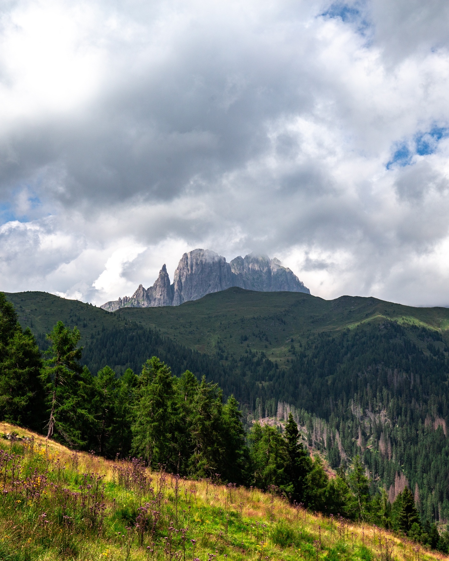 We are in the porphyry range of Lagorai, which extends from Passo Rolle to Pergine Valsugana, crossing the Trentino valleys of Primiero, Valsugana, and Val di Fiemme. The landscape is characterized by large pastures, extensive forests, a dense network of forest roads, and streams running between the slopes.