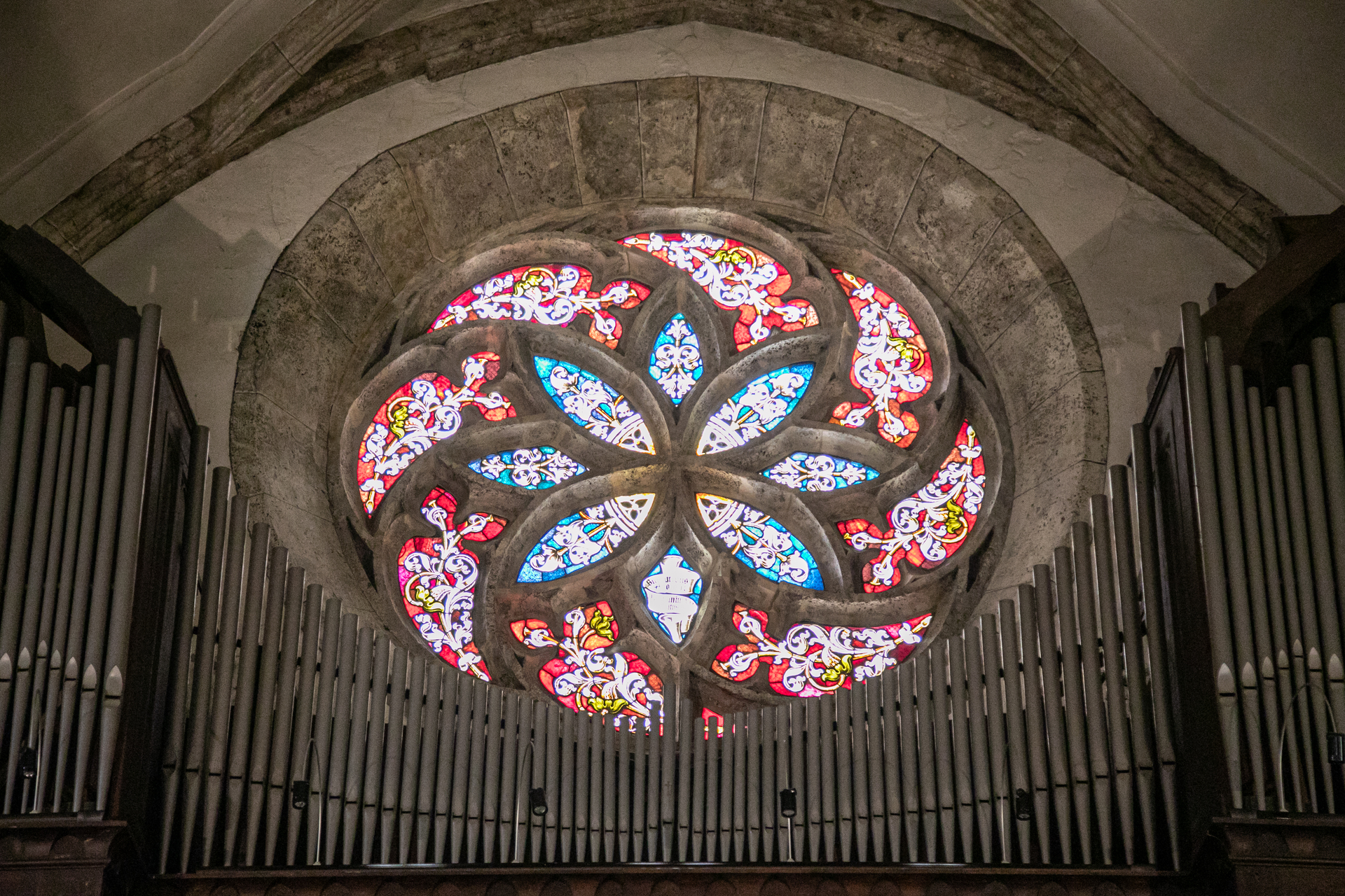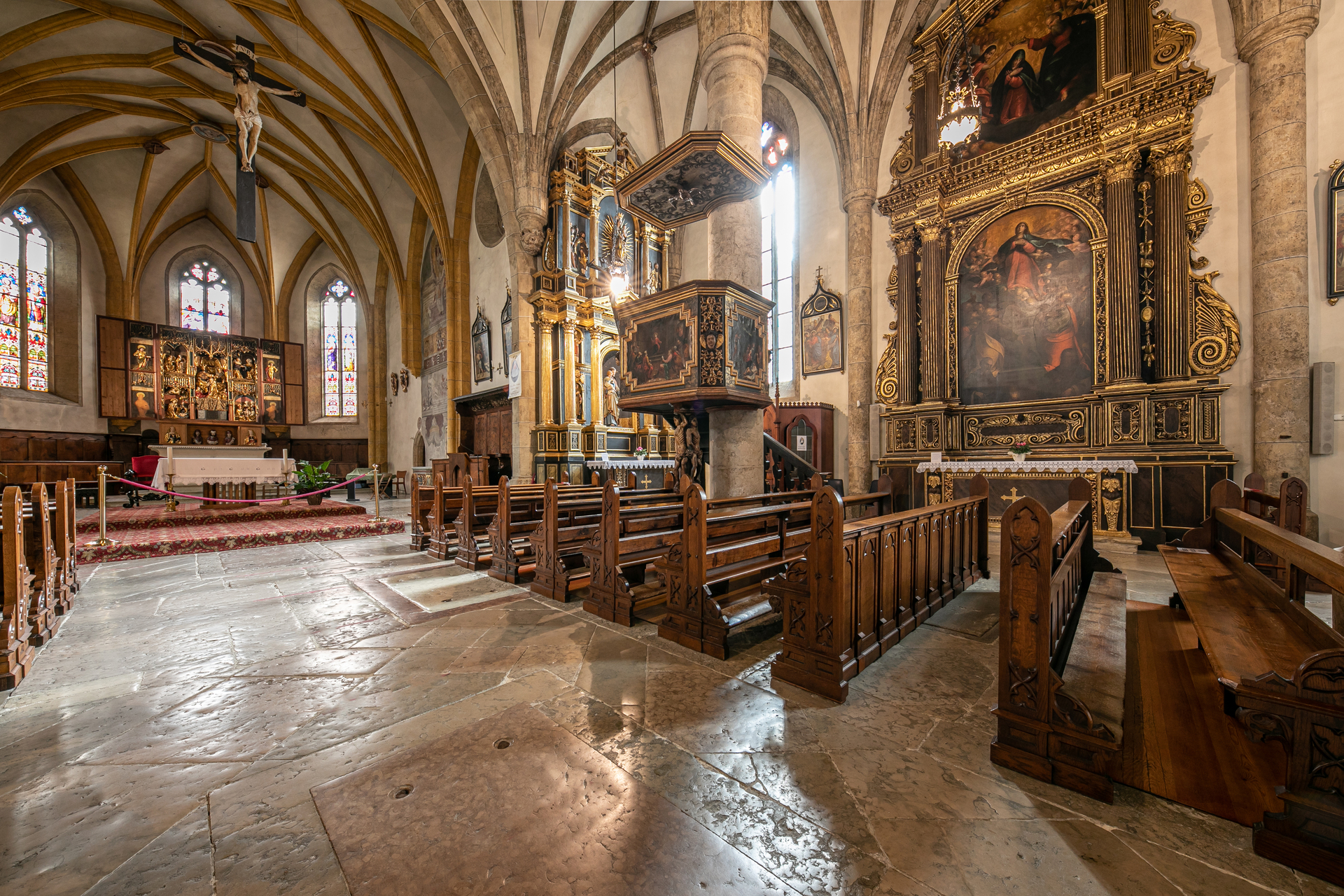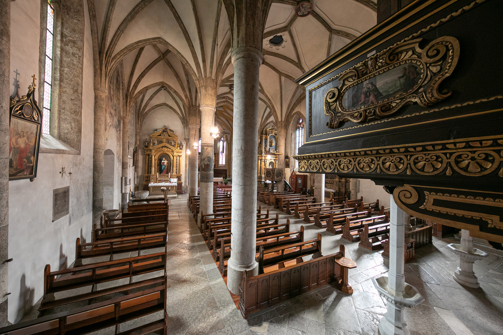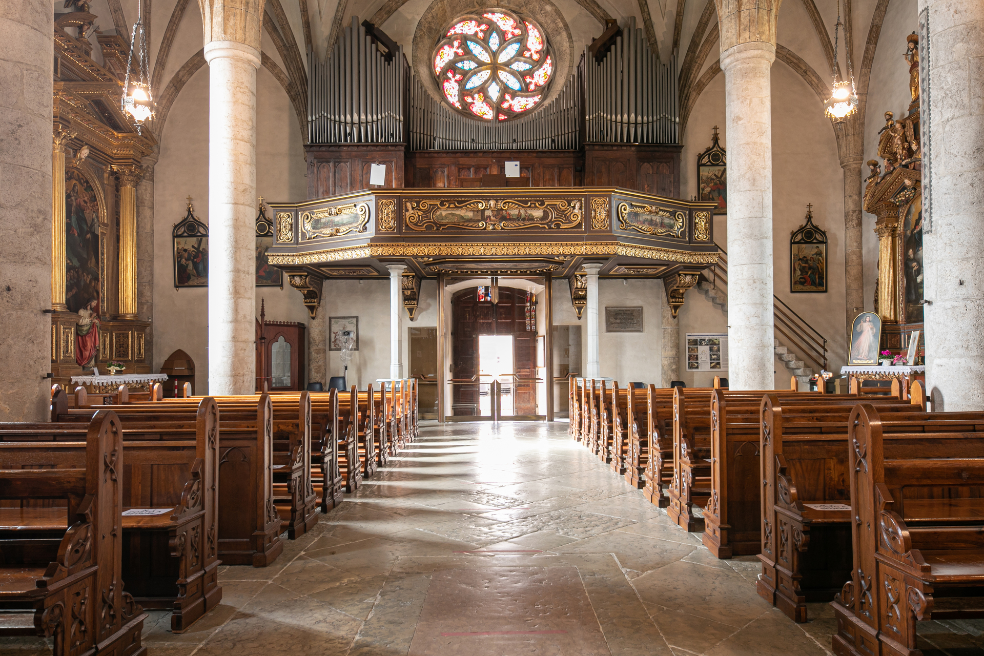 In Gothic style, it was largely built by workers in the area's mines. Their markings are still found on jambs, door arches, windows and in particular on columns.