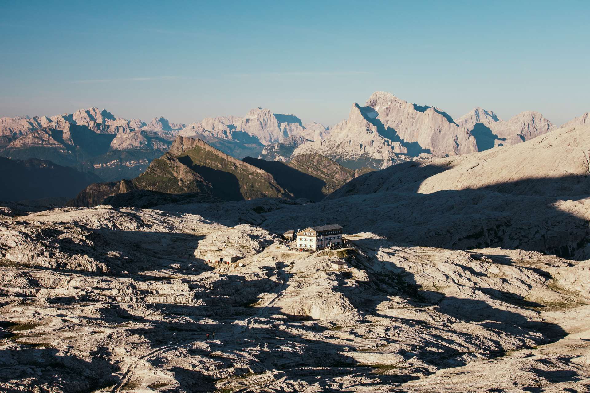 The famous mountains — from Cimon della Pala to Vezzana, from Rosetta to Pala, from Sass Maor to Madonna, continuing with Cima Canali and reaching the smooth face of Agnèr — form a circular crown enclosing a vast plateau of about fifty square kilometres of pure limestone rock, dotted here and there with potentillas, rampions, yellow poppies, saxifrages, gentians and edelweiss.