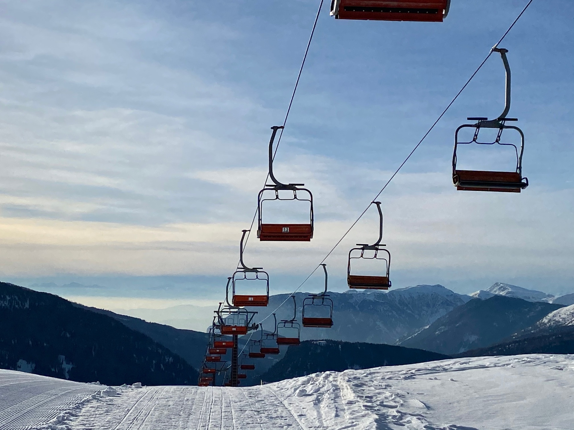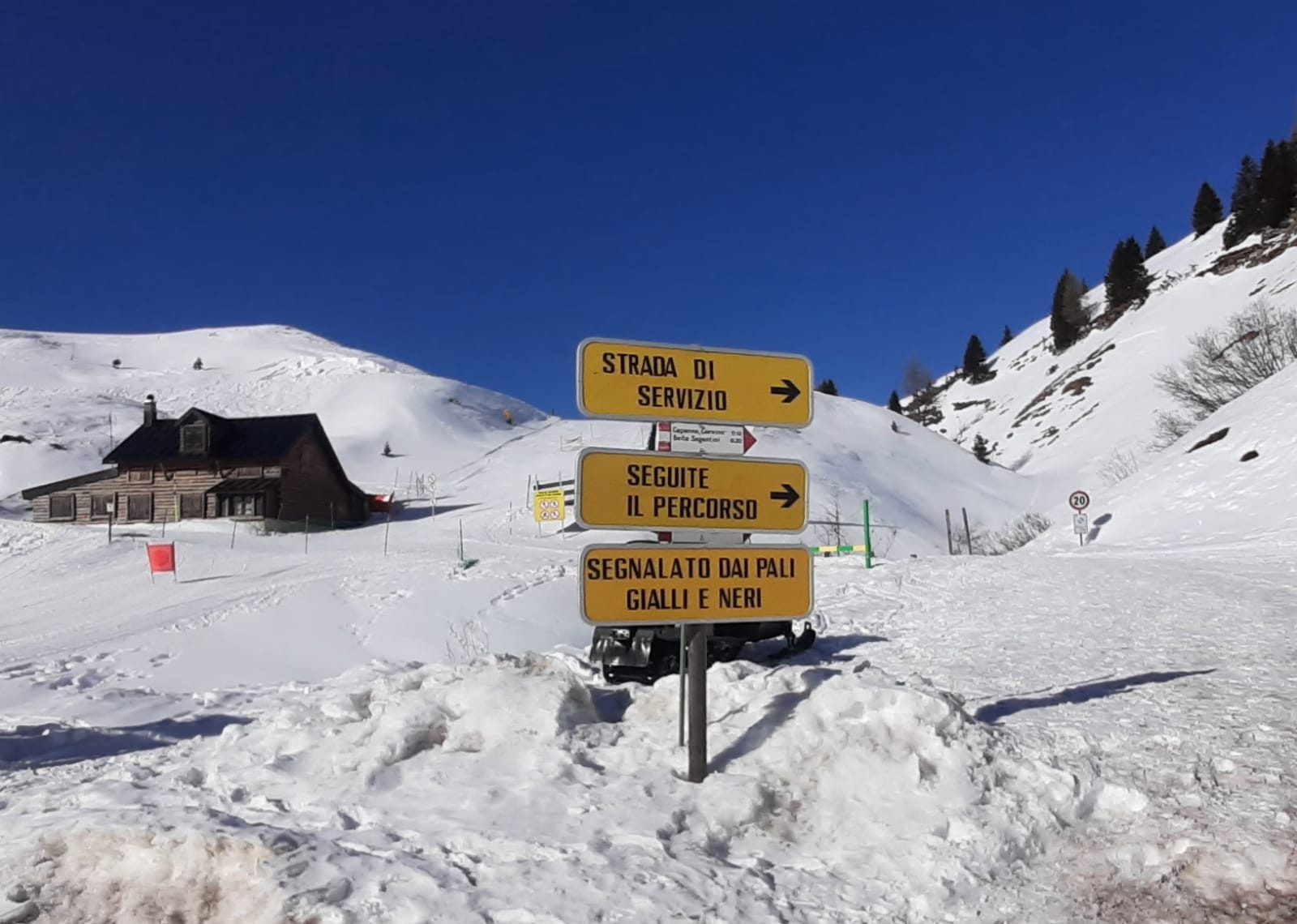 Dalla nuovissima Capanna Cervino la camminata prosegue per ampia traccia fino a giungere, dopo un tratto relativamente pianeggiante, direttamente alla Baita Segantini (2.181 m slm), posta al cospetto delle Pale di San Martino.