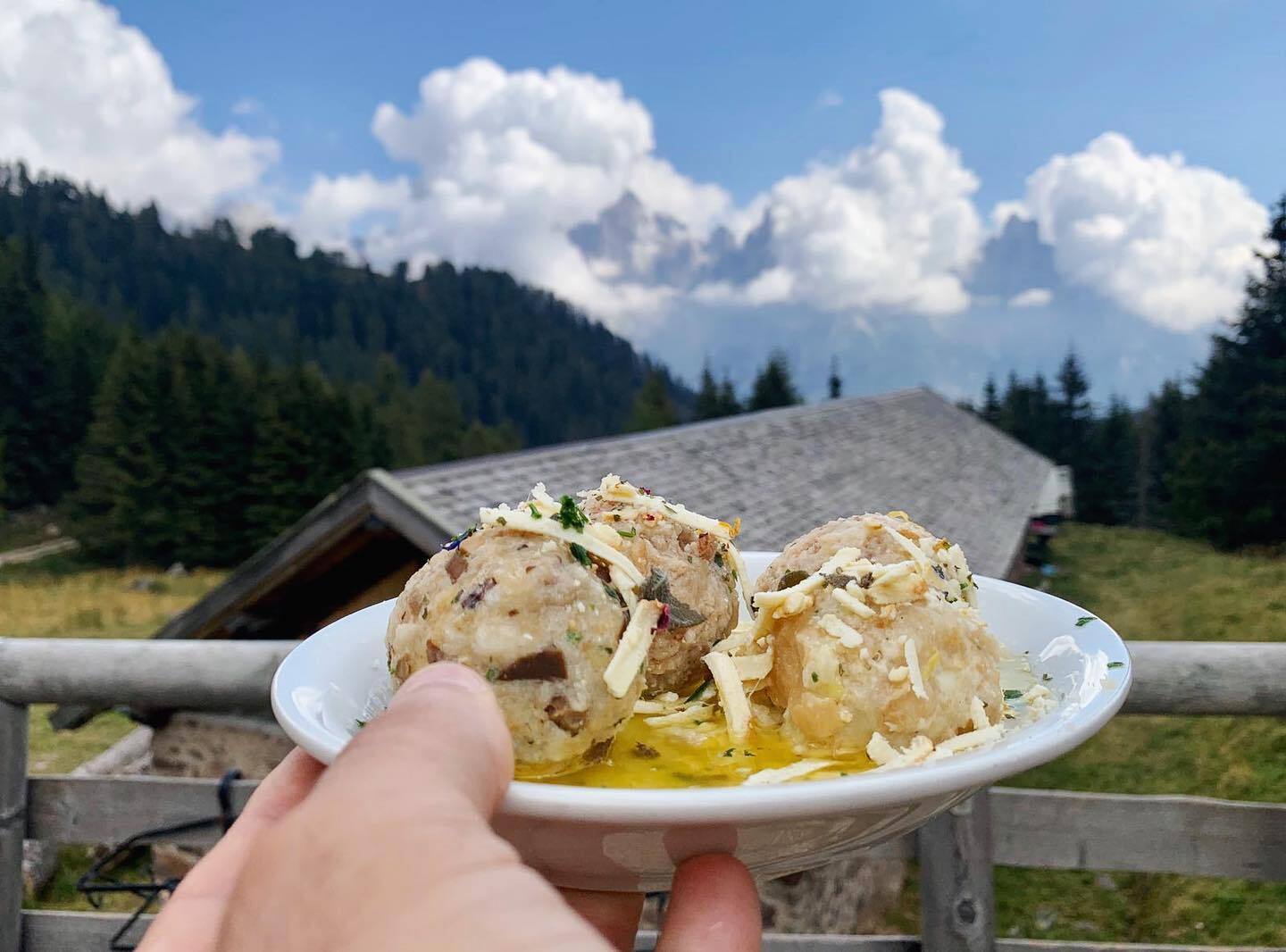 La location davanti alle Pale di San Martino rende ancora più piacevole l’esperienza culinaria.