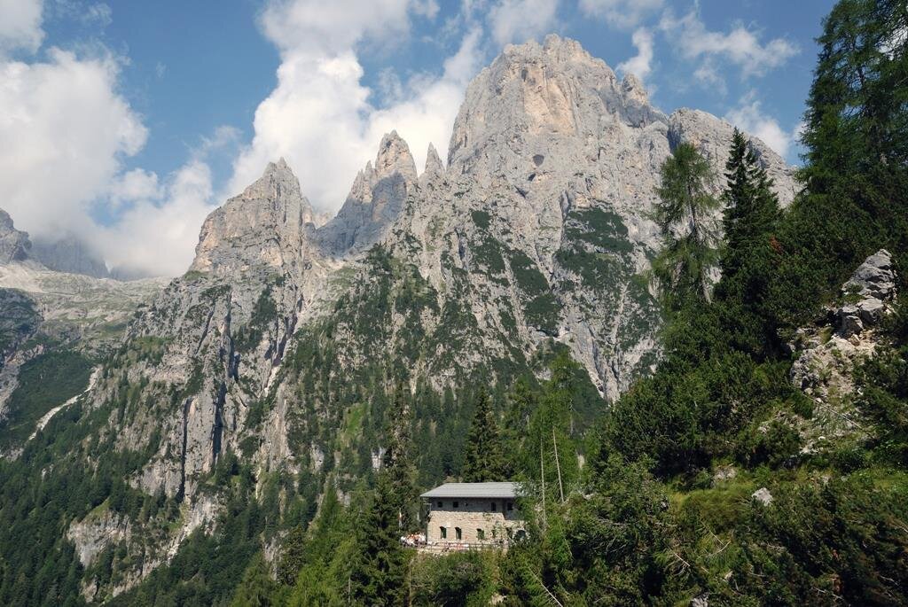 La terrazza del Rifugio Treviso si affaccia sull’alta Val Canali, a 1.631 metri di quota, dove il bosco di conifere è ancora fitto. Ma alzando lo sguardo ecco le pareti meridionali delle Pale di San Martino: la Pala del Rifugio e - più su - il Sass d’Ortiga e la Croda Granda che - pare incredibile - nelle giornate più limpide sono visibili anche da Venezia. Questo Rifugio in pietra venne costruito nel 1897 dagli alpinisti di Dresda, che lo battezzarono Canali Hütte, quindi venne ceduto alla SAT e infine al CAI di Treviso. Può essere la meta di una facile gita, in famiglia, con la salita dalla Val Canali e una pausa nel “larin” (così da queste parti si chiama il focolare) che troverete all’interno. Apertura Inizio giugno - metà ottobre Prima dell'escursione si consiglia di verificare l’effettiva apertura del rifugio contattando il gestore Itinerari Dal Rifugio - con attrezzatura da ferrata - è possibile in meno di 2 ore percorrere il giro della Ferrata del Canalone. In 2 ore e 30 (difficoltà EE) si raggiunge anche Passo Canali risalendo l’alta Val Canali. Oltre Passo Canali, si può raggiungere Cima Fradusta ( 4 ore di cammino) e il Rifugio Rosetta G. Pedrotti, oppure scendere al Rifugio Pradidali camminando 5 ore (difficoltà E). Più impegnativa la Ferrata Fiamme Gialle che conduce al Bivacco Reali, mentre in 4 ore e 30 si scende a Passo Cereda lungo un sentiero senza difficoltà.